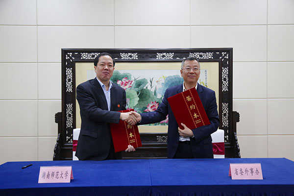 (供稿 发规处)10月16日上午,我校与省委外事办在省委外事办三楼会议厅举行战略合作框架协议签约仪式。省委外事办主任徐正宪,副主任吴宜彪、邱爱华、刘启峰、叶劲松,省友协专职副会长郭向丽,我校党委书记蒋洪新,校长刘起军出席仪式。会议由徐正宪主持。