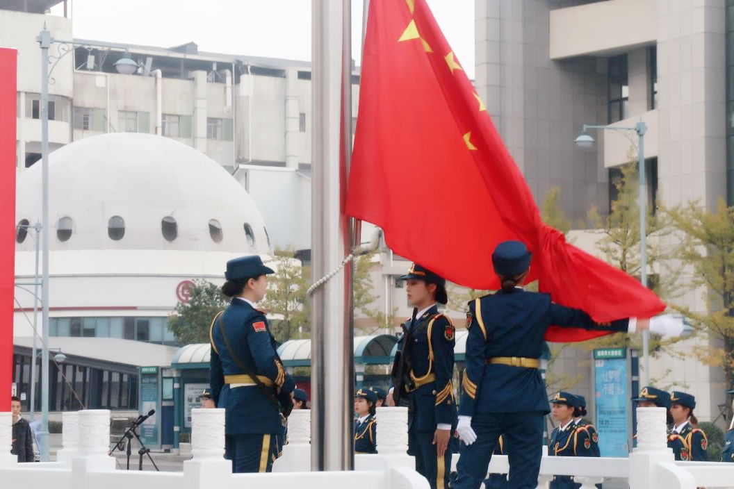 仪式在《歌唱祖国》伴奏中拉开帷幕,校女子国旗护卫队队员手握钢枪,英姿飒爽,迈着整齐的步伐出旗护旗,国旗在雄壮的国歌声中缓缓升起,全体师生唱响国歌并行注目礼。