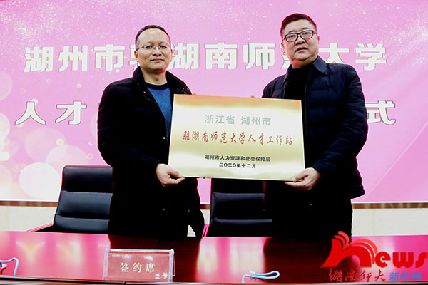 朱新江与我校毕业生就业办公室主任周俊签订人才智力项目战略合作协议并授人才工作站牌匾。
