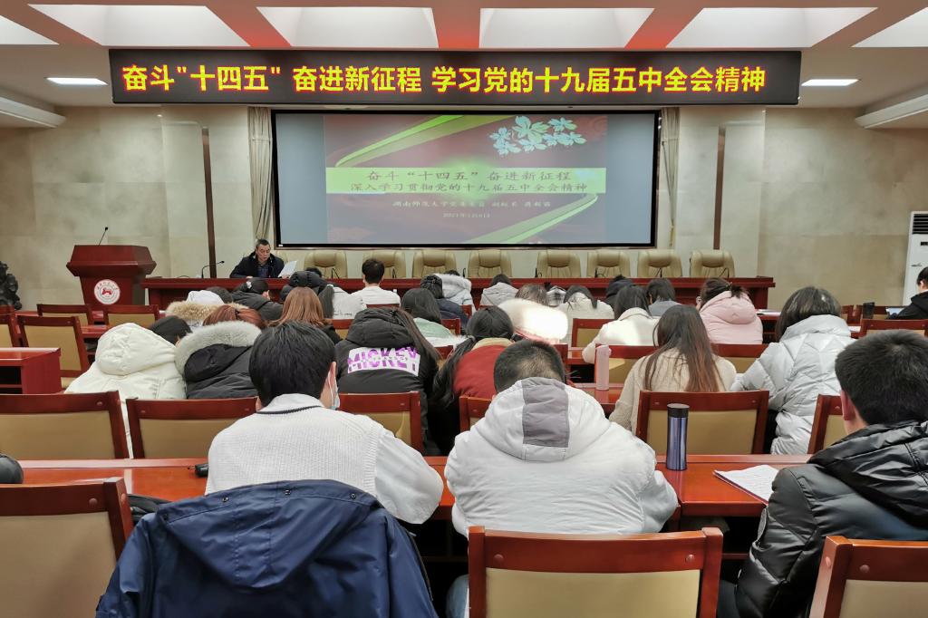 蒋新苗从“十四五”发展规划的主要原则、“十四五”发展规划社会经济发展的主要目标以及2035年要实现的远景目标三个方面展开宣讲。他着重讲述了“十三五”时期取得的成就、当前中国在国际社会面临的机遇与挑战、制定《中共中央关于制定国民经济和社会发展第十四个五年规划和二〇三五年远景目标的建议》(以下简称《建议》)的背景以及规划《建议》的重要特点等方面内容。他表示,身为党员应该积极学习党的十九届五中全会精神,他希望法学院的党员同志在日常学习和工作中,能够主动了解会议内容,自主学习会议精神,做合格党员。