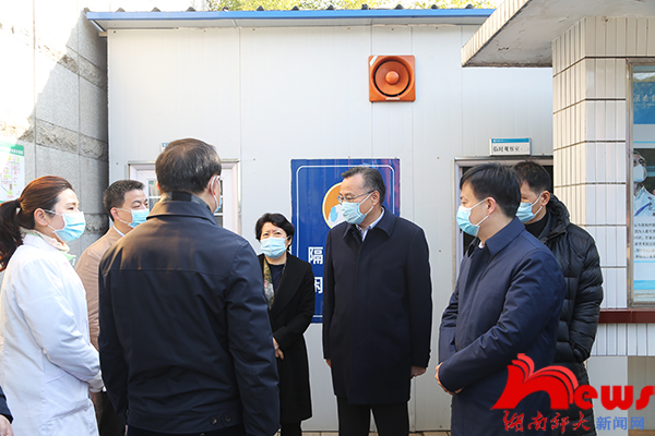 (供稿 附属中学)1月12日上午,国务院联防联控机制督查组组长、财政部副部长余蔚平率队到我校附属中学督查新冠肺炎疫情防控工作。副省长吴桂英,省政府副秘书长彭翔,省卫生健康委员会党组书记、主任陈小春,省财政厅党组成员、副厅长何伟文,长沙市人民政府市长郑建新、副市长刘明理以及我校校长刘起军、副校长唐贤清等陪同督查。