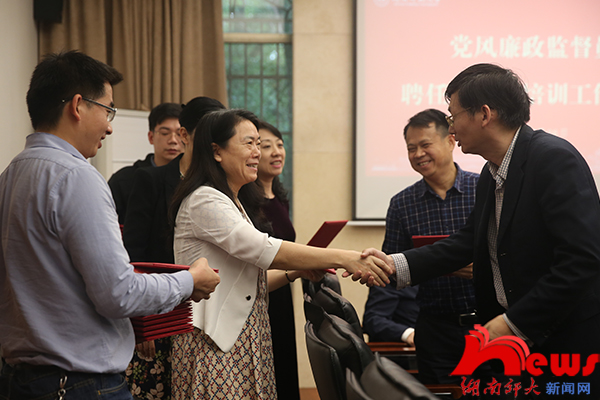 会上,监察处副处长周伊慧宣读了党风廉政监督员聘任决定。党风廉政监督员代表刘飞宇作了表态发言。监察处处长何扬波对受聘党风廉政监督员进行了工作培训。校纪委书记姚春梅为30位受聘党风廉政监督员颁发了聘书。