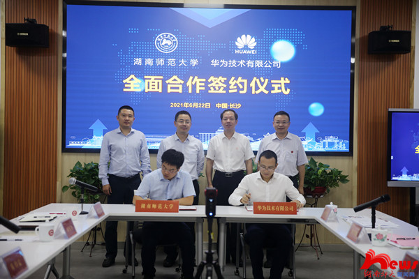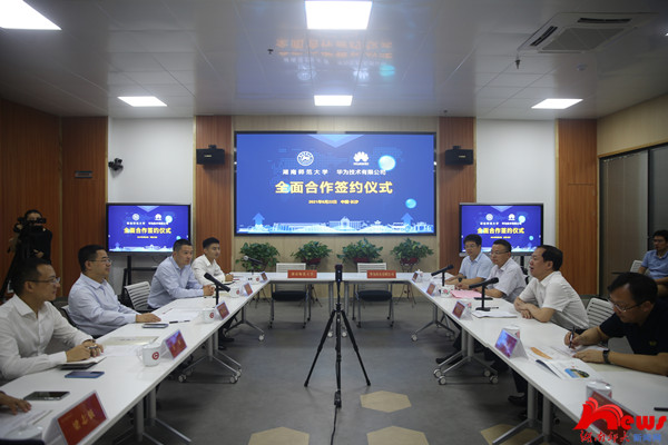 在嘉宾见证下,校信息化中心主任罗常军与华为湖南政企业务部副总经理彭军作为双方执行部门代表签署合作协议。仪式后,华为公司汇报了师大&华为云开发者实验室、5G+VR无边界教室等双方前期合作成果有关情况,与会人员戴上VR眼镜观摩附属小学课堂实况,并就合作领域开展了广泛交流。