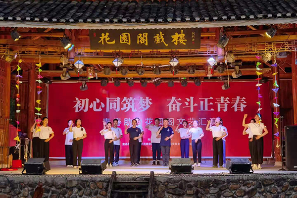 25日晚,我校音乐学院暑期实践团学生、花园阁村民和孩子们进行汇报演出。周俊武一行对参与社会实践和演出的师生进行了慰问。