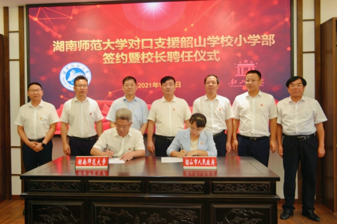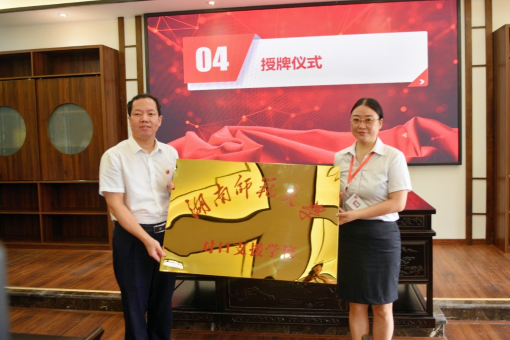 (通讯员 罗晓航)9月6日上午,我校对口支援韶山学校小学部签约仪式在韶山举行。校长刘起军向韶山学校小学部授予“太阳网集团tcy8722对口支援学校”匾牌并讲话。副校长唐贤清代表学校签约。
