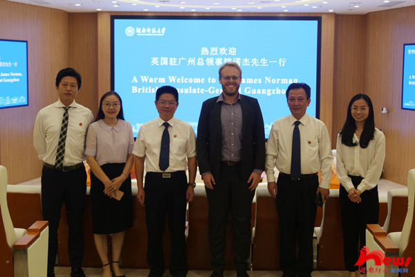 (记者 曾倩 易可馨)9月16日,英国广州总领事馆华南区域合作领事诺杰先生与英国驻广州总领事馆湖南、广西区域高级官员赵娴女士来校访问。副校长唐贤清在图书馆报告厅贵宾室热情接待了客人,国际交流合作处处长陈云江主持交流会。