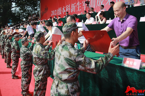 王辉作总结讲话。他代表学校对出席大会的领导和来宾表示热烈欢迎,向14天以来辛勤承训的教官、女子国旗护卫队的队员们和为军训工作付出艰辛努力的同志们表示诚挚的慰问,向圆满完成了军训任务的全体2021级新同学致以热烈的祝贺。他指出,军训是大学的第一堂必修课,练的是身体,磨的是意志,强的是作风,铸的是精神。在接下来的大学新生活中,应该将此前所有的经历视为成长。他对新同学们提出三点希望:一是希望大家强化使命意识,心怀国之大者,用实际行动践行“请党放心,强国有我”;二是希望大家养成自律品格,不弃微末、不舍寸功,成就未来;三是希望大家练就健康身心,用饱满的生命状态和强健体魄去拥抱美好的未来。他激励新生们勇敢追梦,在岳麓山下好读书,祝愿他们能怀抱精彩的大学生活,并成就自己的美好未来!