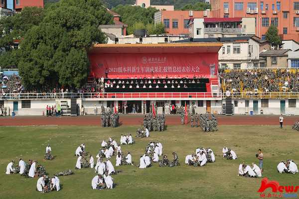 分列式后进行特色汇报表演。物理与电子科学学院、地理科学学院、工程与设计学院共同组成翻花方阵,利用手中道具色彩的变化,凭借着队伍间默契的配合,表达了对党和祖国的赤诚热爱;医学院、教育科学学院、旅游学院、新闻与传播学院、法学院、外国语学院、历史文化学院一同参与战场自救互救方阵,模拟了实地作战和战后救助场景,展现了师大学子不畏困难、勇往直前的风貌;世承书院、化学化工学院和数学与统计学院组成的擒敌拳方阵带来了精彩的群体演练与对战实操,拳掌赫赫生威,展示了师大学子的飒爽英姿;校保卫处组织了反恐防暴演练,体现了学校保障每一名学生生命财产安全的决心;体育学院以战术实战演练向我国特种作战部队致敬,表达了青年人敢于面对困难,对“强国有我”作出身体力行的回应;商学院、文学院和公共管理学院共同带来的匕首操表演整齐划一,锋如长虹,一套操练行云流水,体现了学子们雷厉风行的气魄;音乐学院、美术学院和信息科学与工程学院带来的“集合在党下”表演,以年轻充满活力的舞动姿态,始终追随着迎风招展的党旗,表达了师大学子的青春朝气和对党和国家的无限感恩。