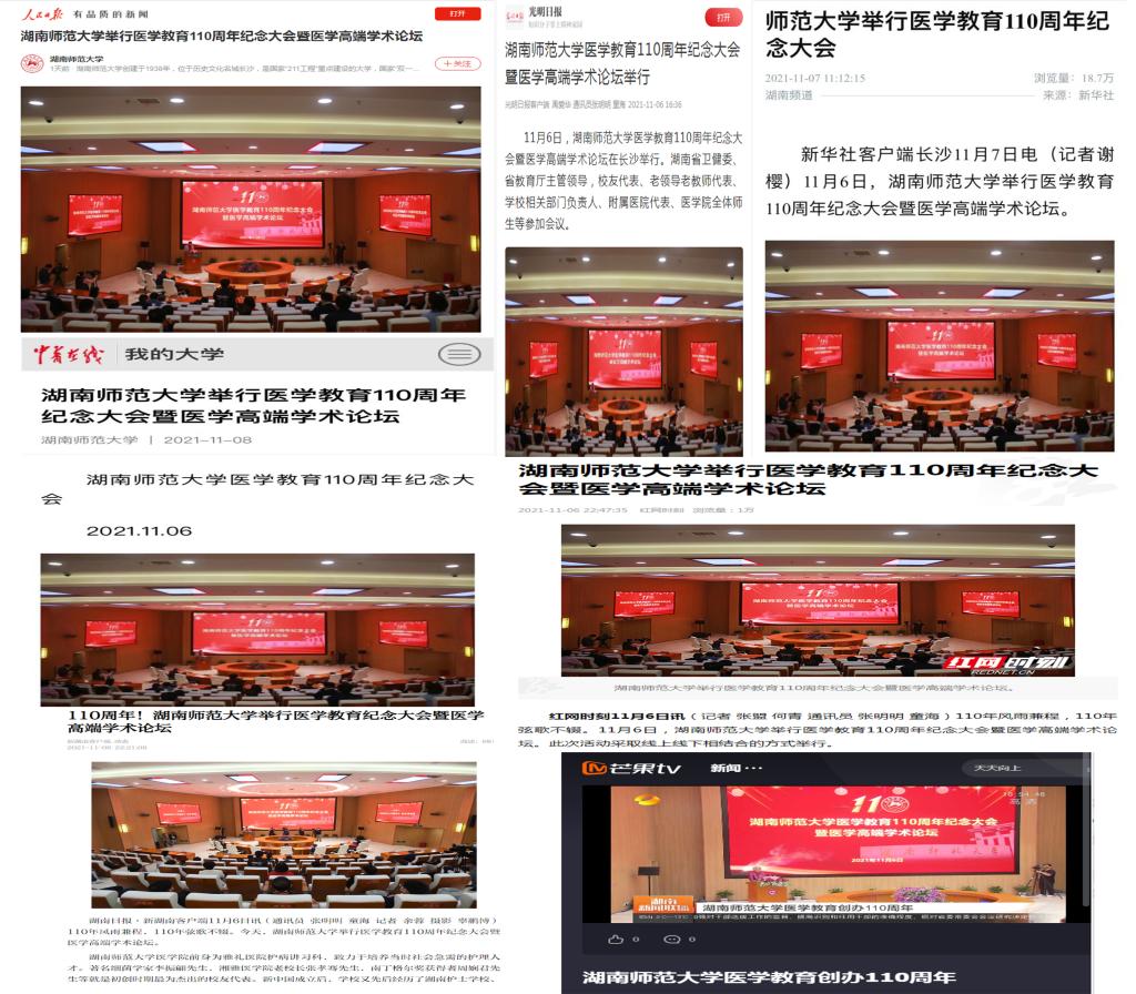 (通讯员 郜江洪 廖映)11月6日,我校医学教育110周年纪念大会暨医学高端学术论坛于图书馆报告厅举行。此次纪念大会被人民日报、光明日报、新华社、中青在线、红网、新湖南、湖南卫视等多家中央、省级主流媒体广泛报道。我校将继续坚持以习近平新时代中国特色社会主义思想为指导,坚持立德树人,着力培养医药卫生事业发展的卓越医学人才,奋力推动医学教育高质量内涵式发展,为服务健康中国,推动湖南省医学教育和卫生健康事业发展作出新的贡献。