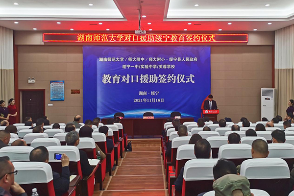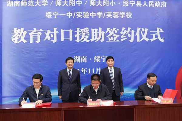 (通讯员 王政)11月16日上午,我校对口援助绥宁教育签约仪式在绥宁一中举行。校党委书记蒋洪新、副校长唐贤清,绥宁县委书记佘芝云、县长夏贤钦、人大常委会主任石亮明、政协主席梁乐高等出席签约仪式。仪式由绥宁县委常委、宣传部部长谢文远主持。