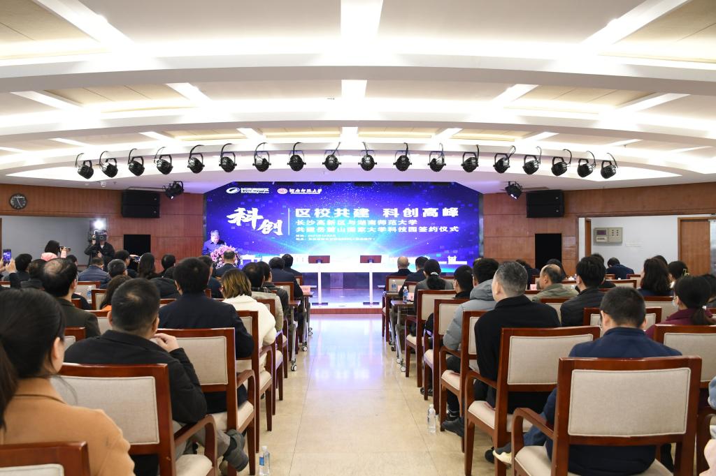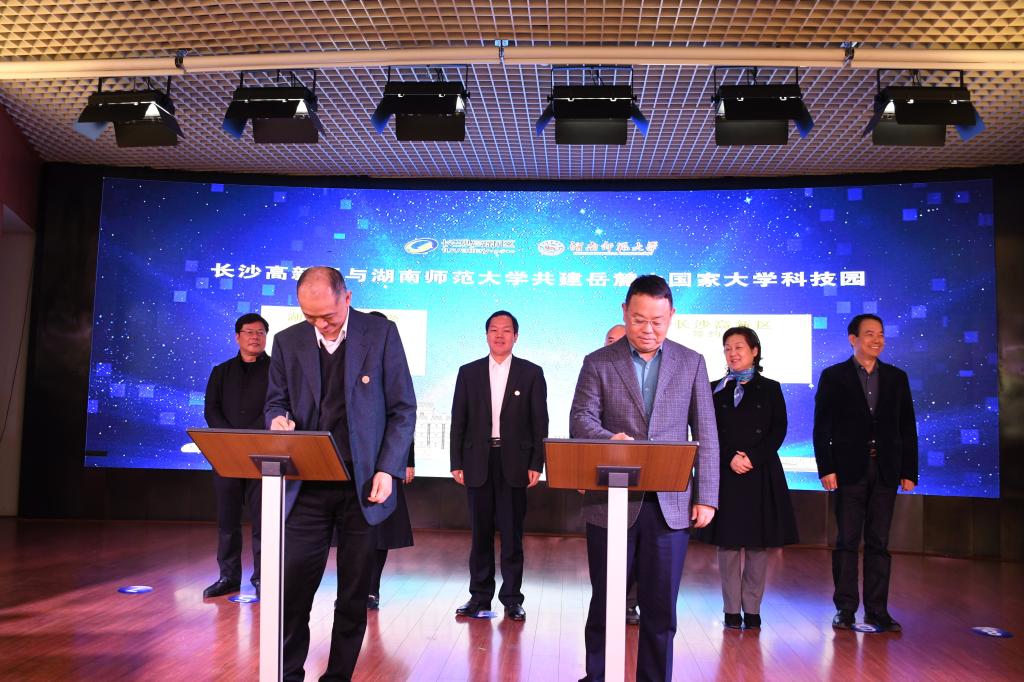 (供稿 资产公司)12月8日上午,我校与长沙高新区共建岳麓山国家大学科技园签约仪式在高新区管委会举行。高新区党工委副书记、管委会主任郭力夫,高新区党工委副书记、管委会副主任吴江,我校校长刘起军,副校长杨震、谢资清出席签约仪式。仪式由高新区党工委委员、一级调研员李平波主持。