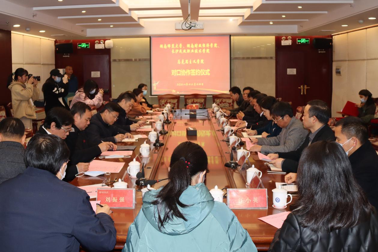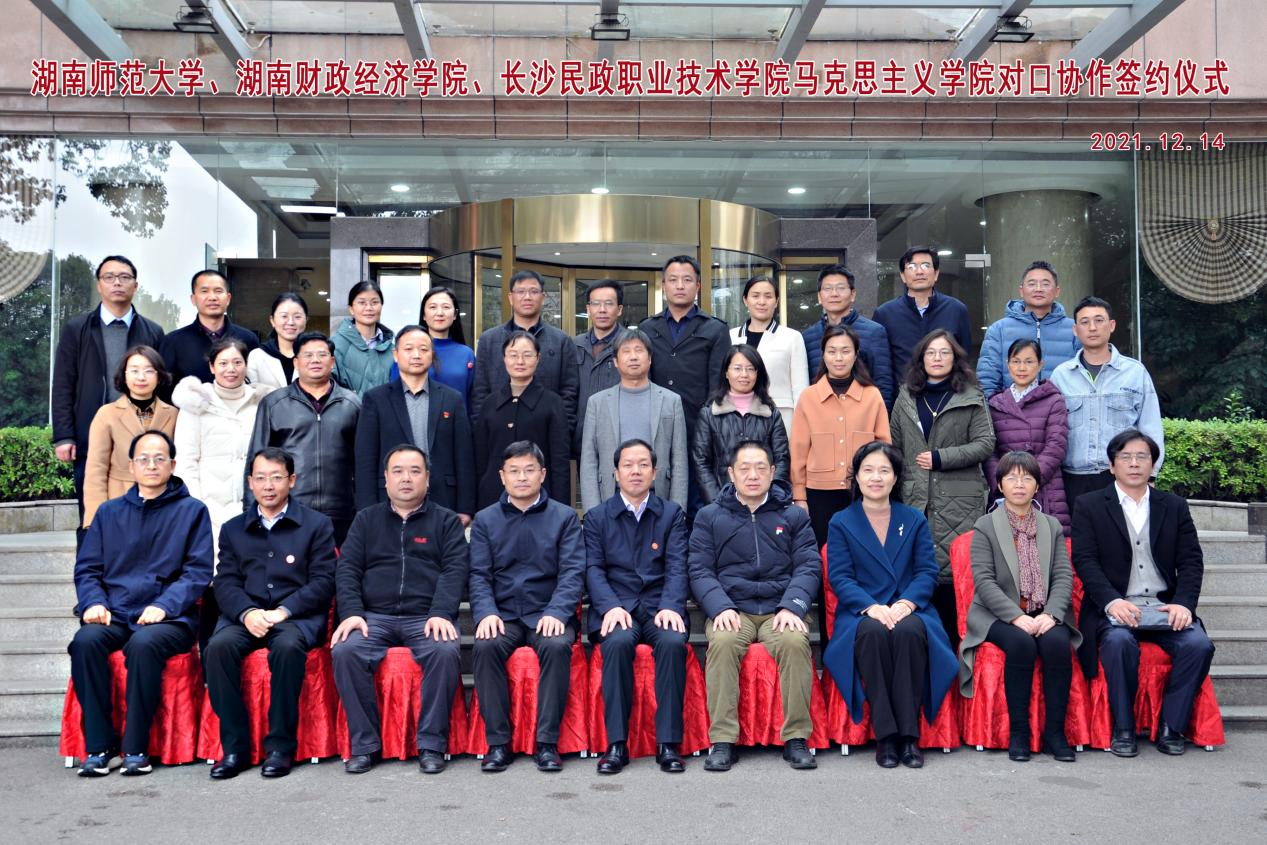 在与会嘉宾的见证下,我校马克思主义学院院长李培超、湖南财政经济学院马克思主义学院院长李茂平、长沙民政职业技术学院马克思主义学院院长张晓琳签订了对口协作协议。