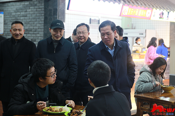 刘起军一行赴食堂考察设施和餐饮情况。正值午饭时间,刘起军与学生亲切交谈,询问学生对食堂口味、价格等方面的意见。他指出,食堂不仅要强调食品安全,也要充分考虑到不同地域的学生饮食需要,为学生提供温馨的餐饮服务。