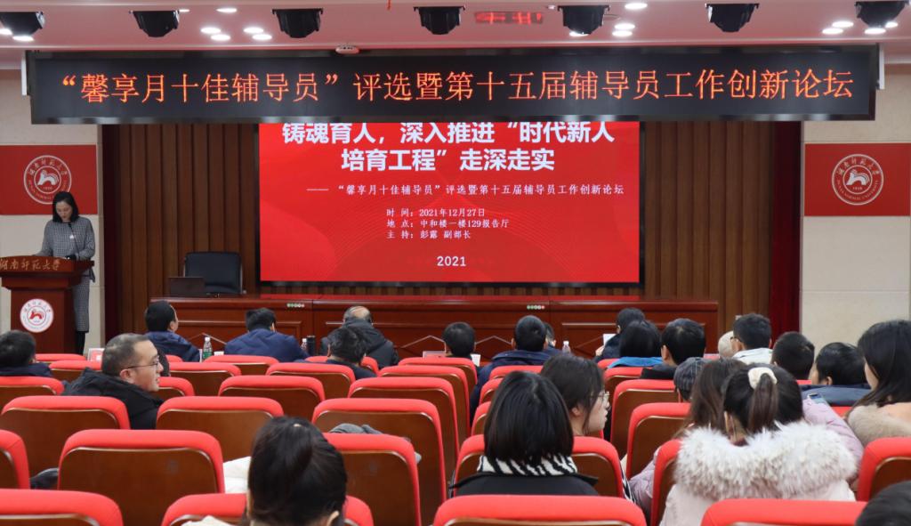 (通讯员 陈榕 孙一鑫 陶迎春 蔡田甜)12月27日,我校2021年度学生工作总结、学院特色学生工作展示暨“馨享月十佳辅导员”评选活动在中和楼129报告厅举行。副校长王辉出席活动。活动分为2021年学生工作总结暨学院特色学生工作展示、“馨享月十佳辅导员”评选暨第十五届辅导员工作创新论坛两个阶段,活动由学生工作部(处)副部(处)长彭露主持。
