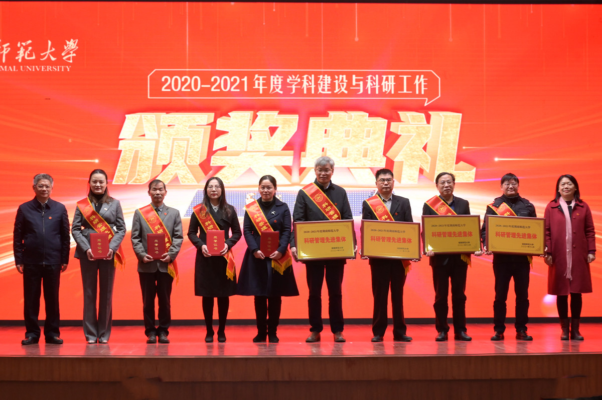 校党委书记蒋洪新、校长刘起军、校党委副书记周俊武、校纪委书记姚春梅、副校长唐贤清等为获表彰的科研标兵、青年标兵、管理先进集体和先进个人颁奖。长江学者刘铁芳教授、国家“优青”获得者廖洁桥教授和外国语学院院长曾艳钰教授分别致颁奖词。