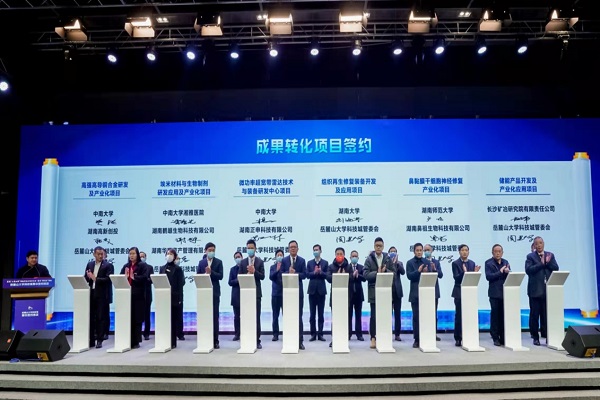 我校刘少军院士团队领衔的淡水鱼类发育生物学国家重点实验室中试基地、卢明教授团队领衔的鼻黏膜干细胞神经修复产业化项目现场签约。孙舜尧教授领衔的水晶湘绣数字创意智能研究院及产业化项目入选本次大科城“五个十”项目成果转化类别代表项目。