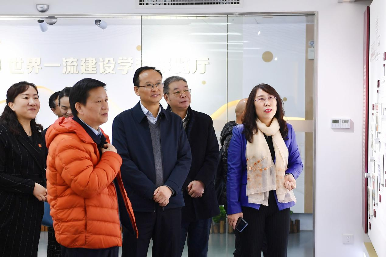 覃万成一行考察了世界一流学科建设展厅,听取了相关负责人的情况介绍,详细询问了教学科研、人才培养、学科建设等情况。