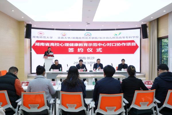 (通讯员 周颖 孙艳艳)3月9日上午,湖南省高校心理健康教育示范中心对口协作签约仪式在我校励德楼省网络思政中心报告厅举行。长沙幼儿师范高等专科学校党委副书记、校长李毅,我校副校长王辉出席此次仪式。仪式由我校心理健康教育与咨询中心主任余洁主持。