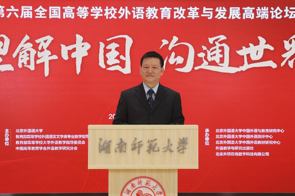 (通讯员 王耀光)3月19日至20日,第六届全国高等学校外语教育改革与发展高端论坛在北京及线上同步开幕,本届论坛主题为“理解中国 沟通世界”。中宣部国际传播局陈雪亮副局长,教育部高等教育司武世兴副司长,中国原驻英国大使查培新等出席开幕式。教育部高等学校英语专业教学指导分委员会主任委员、欧洲科学院院士、我校党委书记蒋洪新教授出席论坛,并作题为“乡村振兴战略中的外语担当”的线上主旨报告。