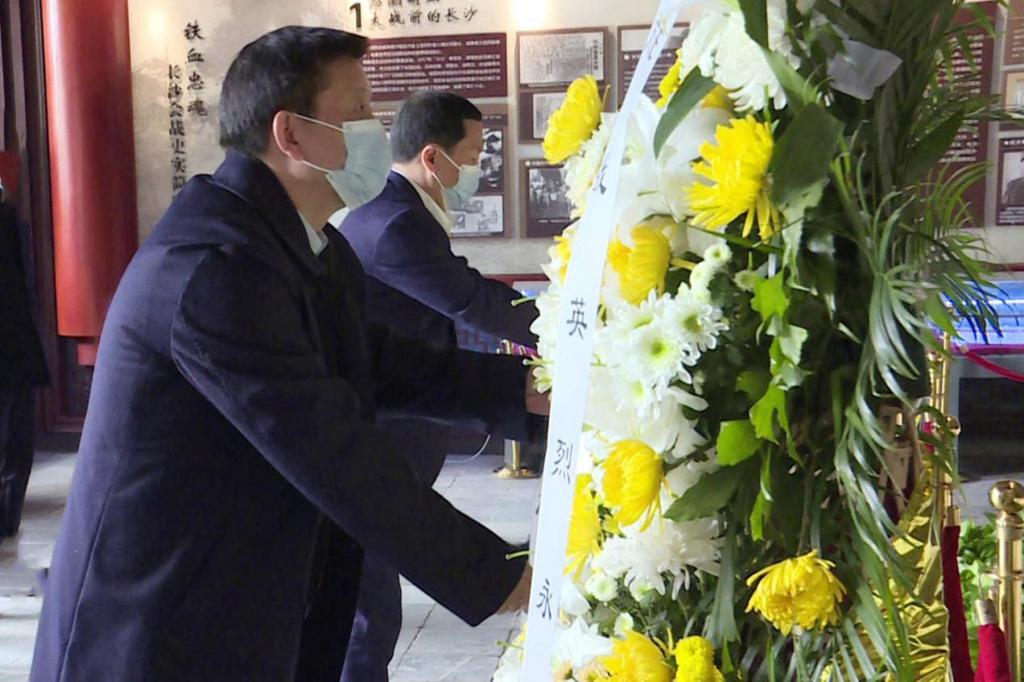 在麓山忠烈祠,蒋洪新、刘起军代表全校师生向烈士敬献花篮,整理缎带,并率随行人员向烈士行三鞠躬礼,表达对抗战英烈的崇敬与哀思,缅怀为中国人民抗战胜利奉献终身的革命先烈和民族英雄。