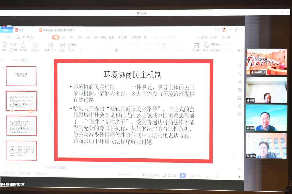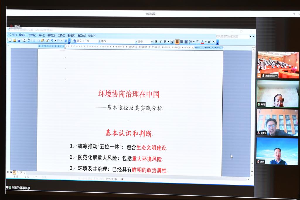 随后,7位专家分别进行主题报告。生态环境部法规与标准司别涛司长的《环境协商治理在中国——基本途径及其实证分析》,中国法学会环境资源法学研究会副会长、中国人民大学法学院、湖南大学法学院周珂教授的《环境协商治理的整体性思维》,中国法学会行政法学研究会副会长、中国法学立法学研究会副会长、北京大学法学院湛中乐教授的《生态环境治理中的协商与合作》,我校生态文明研究院院长刘湘溶教授的《关于环境协商治理的“一点体会 三点看法”》,湖南省政协研究室唐宇文主任的《环境协商治理的湖南实践》,中南林业科技大学校长、湖南专业特色智库——湖南绿色发展研究院院长廖小平教授的《环境协商治理的三个理论问题》,湖南省委宣传部社科规划办陈湘文主任的《积极发挥智库在环境协商治理中的重要作用》等报告依次围绕“全过程民主视域下的环境协商治理”的核心与理论前沿问题进行了分享与探讨。