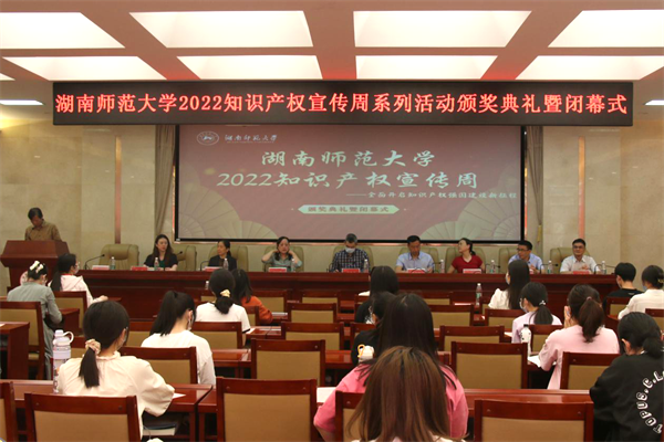 (记者 段均 通讯员 程诺)5月5日下午,我校2022年知识产权宣传周系列活动颁奖典礼暨闭幕式在法学院举行。湖南省市场监督管理局专利运用处处长何萍、长沙市知识产权局副局长黄向红、我校副校长蒋新苗出席颁奖典礼。本次颁奖典礼由院正处级专职组织员陈胜国主持。