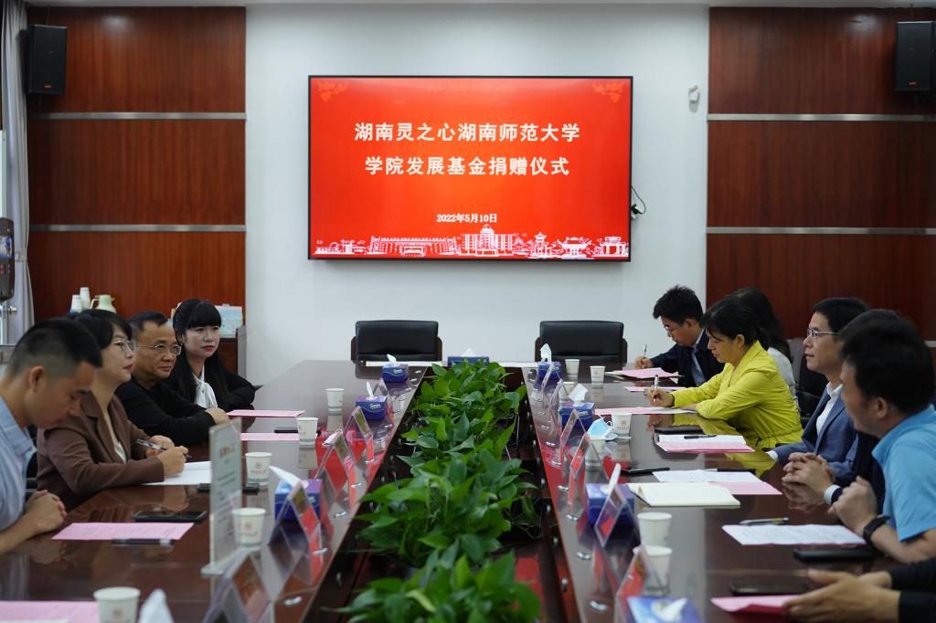 (供稿 教育基金会)5月10日上午,我校学院发展基金捐赠仪式在校办公楼二会议室举行。湖南灵之心公司捐赠人民币壹佰万元整,用于历史文化学院、教育科学学院建设发展。湖南灵之心心理学应用技术有限公司董事长周淋燕、副总经理丁亚运,我校副校长王辉出席仪式。校友总会、教育基金会秘书长梁勇主持仪式。