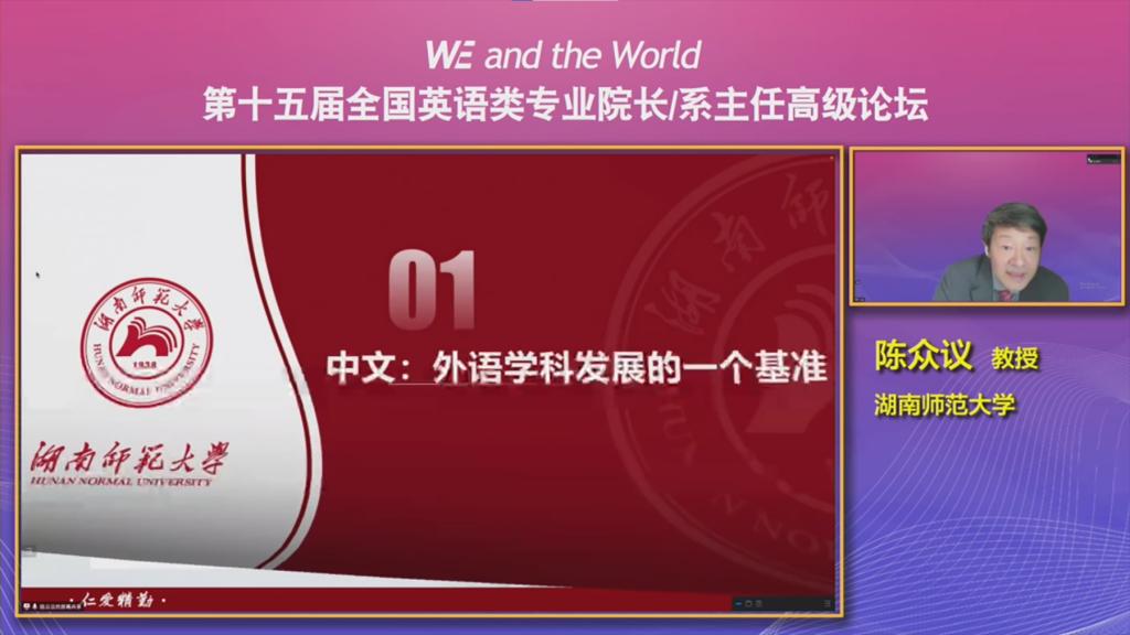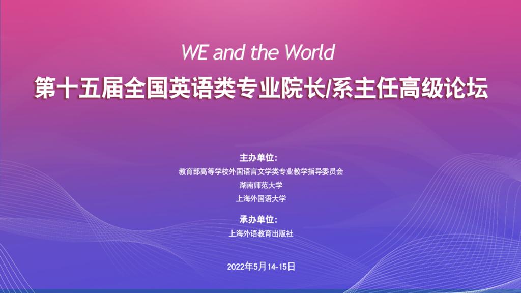 (通讯员 胡桑 王耀光)5月14日上午,第十五届全国英语类专业院长/系主任高级论坛在线上拉开帷幕。本次论坛以“WE and the World”为主题,由教育部高等学校外国语言文学类专业教学指导委员会、上海外国语大学与我校联合主办。教育部高等学校外国语言文学专业教学指导委员会主任委员孙有中,上海外国语大学校长李岩松,我校党委书记、欧洲科学院院士蒋洪新等出席论坛开幕式并致辞,论坛开幕式由上海外国语大学副校长查明建教授主持。