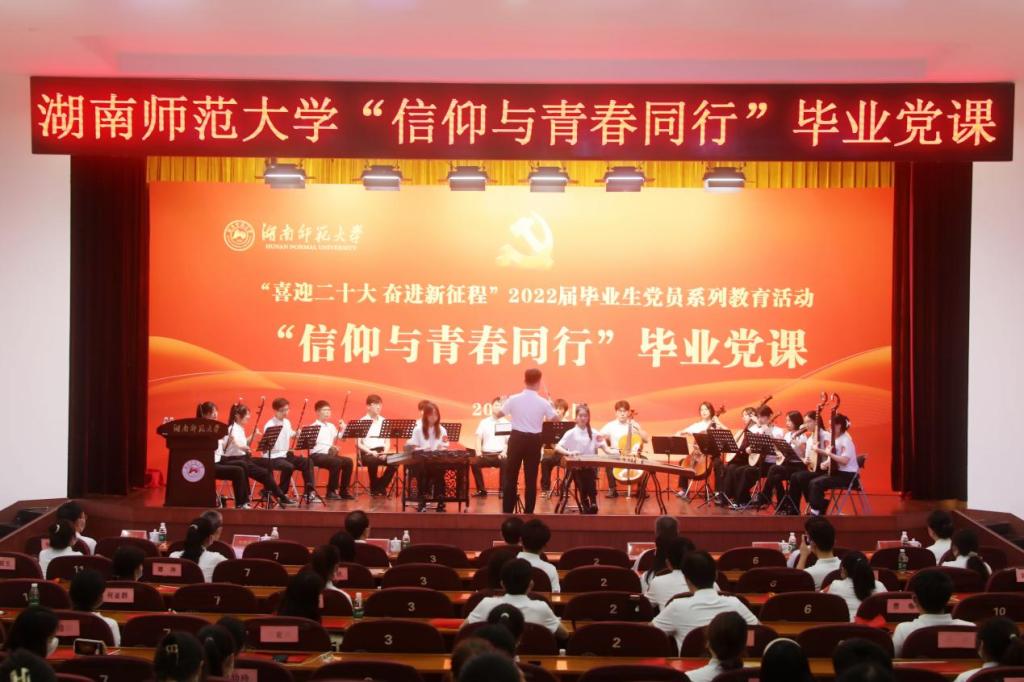 活动开始前,音乐学院艺术团的同学以民乐合奏、合唱等方式演奏红色经典音乐《浏阳河》《微山湖》《我爱你中国》,给参加活动的毕业生党员代表呈现了一堂特色鲜明的音乐微党课。