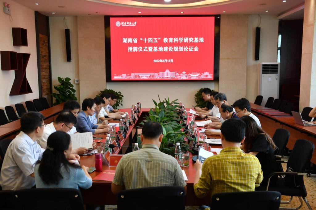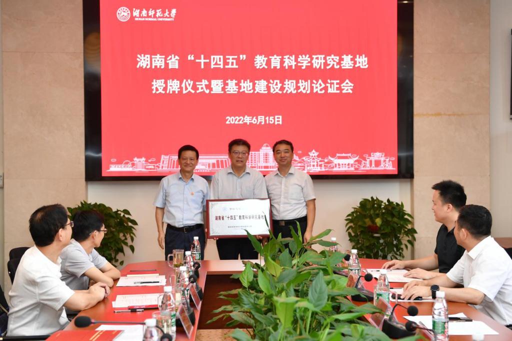 (记者 马铁泉 冯振辉)6月15日,我校在教科院会议室举行湖南省“十四五”教育科学研究基地授牌仪式暨基地建设规划论证会。省委教育工委副书记、省教育厅党组成员、省教育科学规划领导小组副组长王建华,省教育科学规划领导小组副组长兼办公室主任、省教育科学研究院院长石灯明,我校党委书记蒋洪新出席仪式。授牌仪式由副校长谢资清主持。