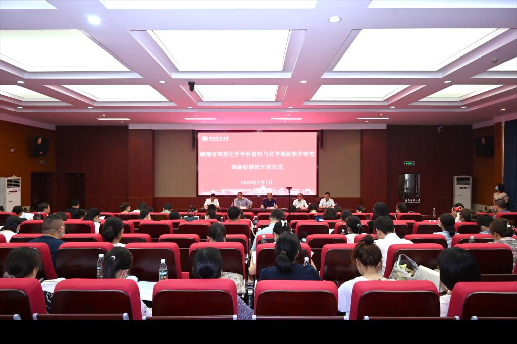 (通讯员 王言平 李佳)7月1日上午,2022年湖南省高校化学学科前沿与化学课程教学研究高级研修班在我校举行开班仪式。此次开班仪式通过线上线下相结合的形式召开,中国科学院院士、上海交通大学分子医学研究院院长、中国科学院基础医学与肿瘤研究所所长谭蔚泓,天津大学副校长胡文平教授、我校副校长杨震出席仪式。仪式由化学化工学院党委书记谭东波主持。