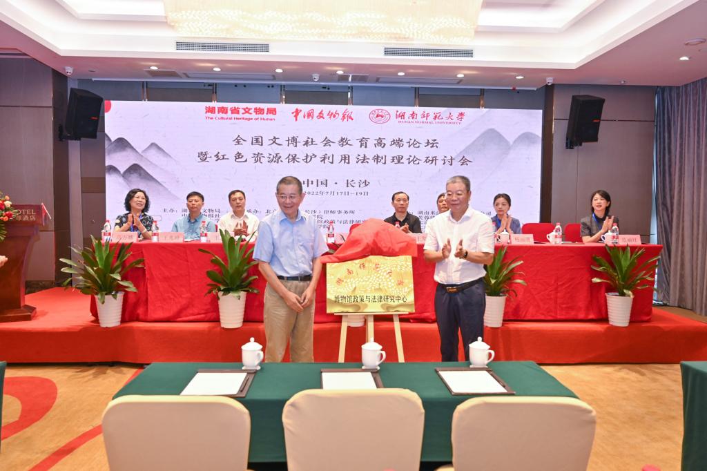开幕式后随即举行了2022年社教宣传推介活动启动仪式。仪式由我校法学院院长肖北庚教授主持,北京国文融创文化发展有限公司副总经理陈伟发表讲话。全国人大教科文卫委员会文化室原主任朱兵与周俊武共同为太阳网集团tcy8722博物馆政策与法律研究中心揭牌。