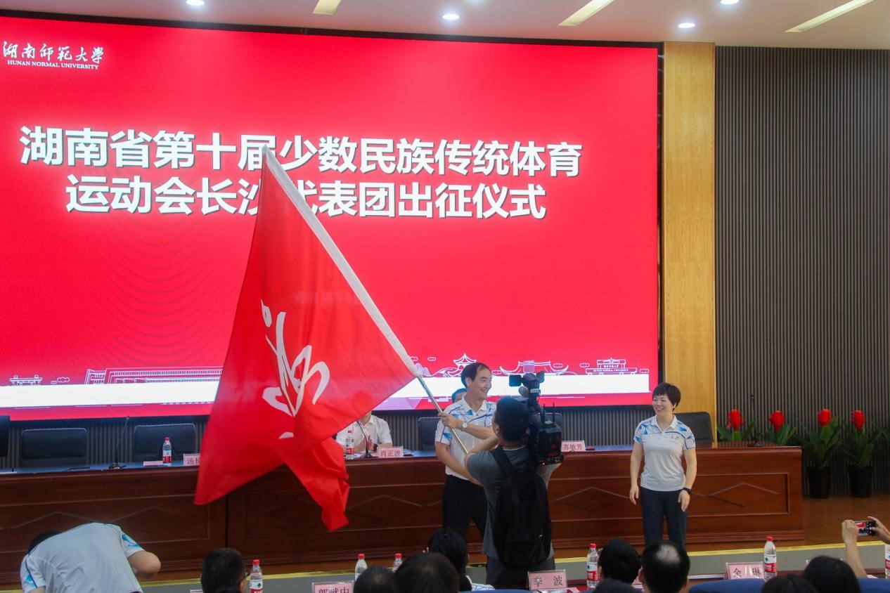 长沙市体育局局长苏敏芳向代表队授代表团团旗,我校体育学院院长汤长发接旗。