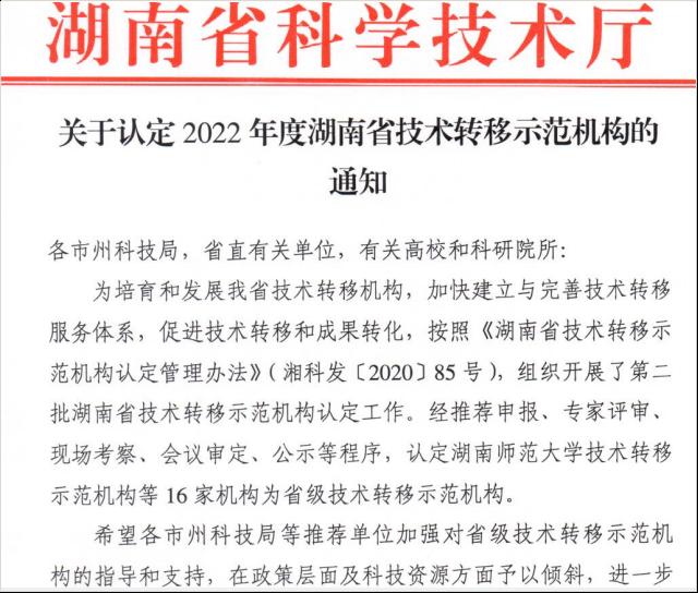(供稿 科技处)近日,从省科技厅传来喜讯,根据《关于认定2022年度湖南省技术转移示范机构的通知》,我校获批2022年度湖南省技术转移示范机构认定。