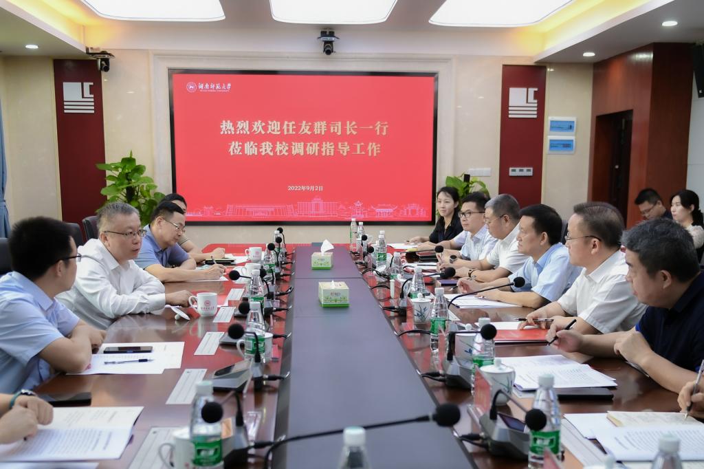 (记者 马铁泉 刘茵 冯振辉)9月2日上午,教育部教师工作司司长任友群一行来我校调研并举行座谈会。省委教育工委委员、省教育厅党组成员、总督学郭建国参加调研。校党委书记蒋洪新,副校长刘子兰陪同调研,座谈会由校党委副书记周俊武主持。