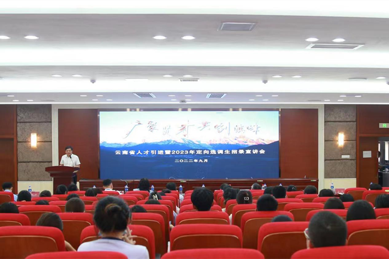 云南省医疗保障局党组成员、副局长金梅,云南省昭通学院党委副书记陈永华,云南省定向选调生招录宣讲工作组,我校招生与就业指导处,研究生院等相关部门负责人及部分毕业生参加会议。
