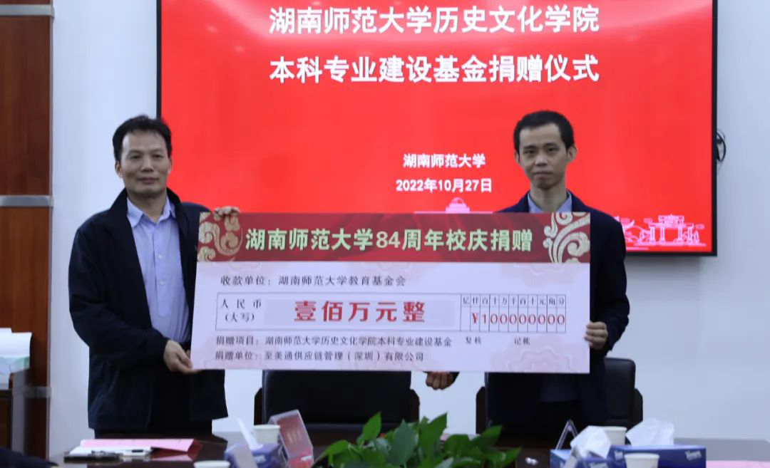 (供稿 校友总会)10月27日下午,我校历史文化学院本科专业建设基金捐赠仪式在校办二会议室举行。至美通供应链管理(深圳)有限公司一次性捐赠人民币壹佰万元整,用于历史文化学院本科专业建设。历史文化学院2008级校友、至美通供应链管理(深圳)有限公司总经理徐益,我校副校长王辉出席仪式。校友总会·教育基金会秘书长梁勇主持仪式。