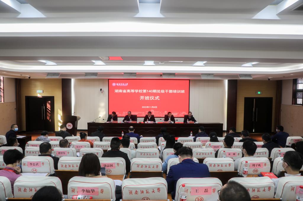 (记者 马铁泉 刘茵)11月8日上午,我校在中和讲堂举行湖南省高等学校第140期处级干部培训班开班仪式。省委教育工委副书记、省教育厅党组成员、一级巡视员王建华,我校党委书记蒋洪新出席开班仪式。仪式由校党委副书记周俊武主持。