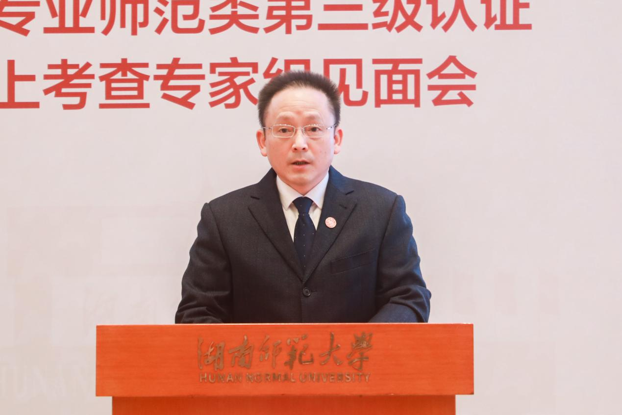 蒋洪新向各位专家领导对我校英语专业第三级认证工作的支持表示热烈欢迎和衷心感谢。他表示,办好师范教育是全国高校共同的责任担当,我校将以本次师范专业三级认证为契机,继续加大教师教育建设和师范生人才培养力度,全面深化师范专业内涵建设,努力为国家乃至世界的基础教育贡献更多师大智慧和师大力量。