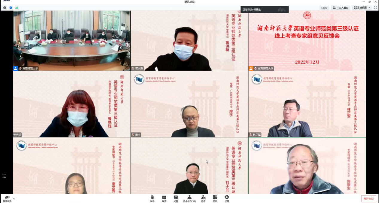 (记者 马铁泉 冯振辉)近日,受教育部教育质量评估中心委托,以南京师范大学原副校长傅康生教授为组长的认证专家组一行4人,对我校英语专业开展为期12天的师范类专业第三级认证线上考查工作。专家组全体成员、省教育厅教师工作与师范教育处副处长缪高勇,我校党委书记蒋洪新、副校长刘子兰出席相关活动。