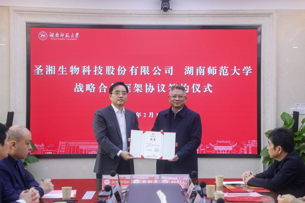 (记者 马铁泉 冯振辉)2月16日上午,我校与圣湘生物科技股份有限公司战略合作框架协议签约仪式在中和楼六楼会议室隆重举行。圣湘生物科技股份有限公司董事长戴立忠、副总经理邓中平,我校党委书记蒋洪新,副校长唐贤清、谢资清出席签约仪式。仪式由副校长杨震主持。