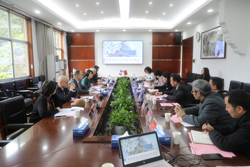 姚春梅对胡建谊一行的到来表示热烈欢迎。她从学校历史、学科建设、师资队伍建设、人才培养、国际交流等方面介绍了我校的基本情况。她向法国总领馆对我校的支持表示感谢,并希望在中法两国交流进展顺利、前景璀璨的前提下,推动我校与法国高水平大学开展实质性科研合作,促进我校对法交流迈上新台阶、打开新局面。