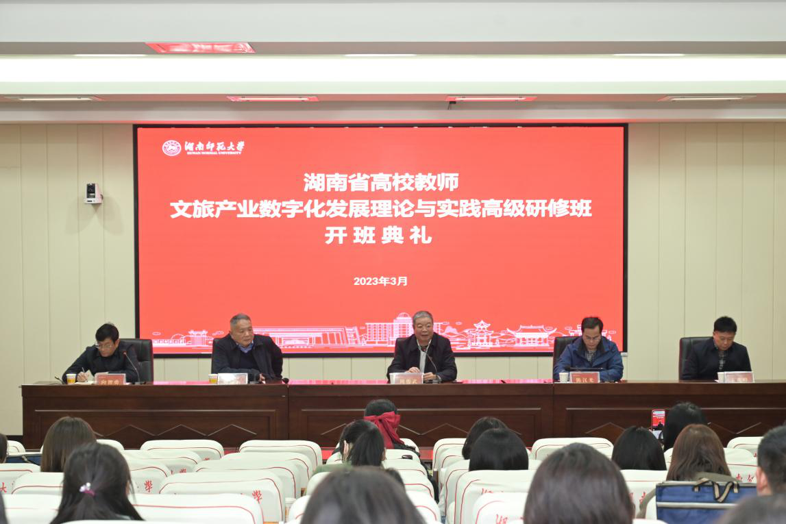 (供稿 旅游学院)3月17日下午,由湖南省高等学校师资培训中心主办、我校旅游学院承办的湖南省高校教师文旅产业数字化发展理论与实践高级研修班在我校中和讲堂开班。湖南省教育厅教师工作与师范教育处四级调研员陈汉光,我校党委副书记周俊武出席开班仪式。仪式由我校旅游学院副院长向智勇主持。