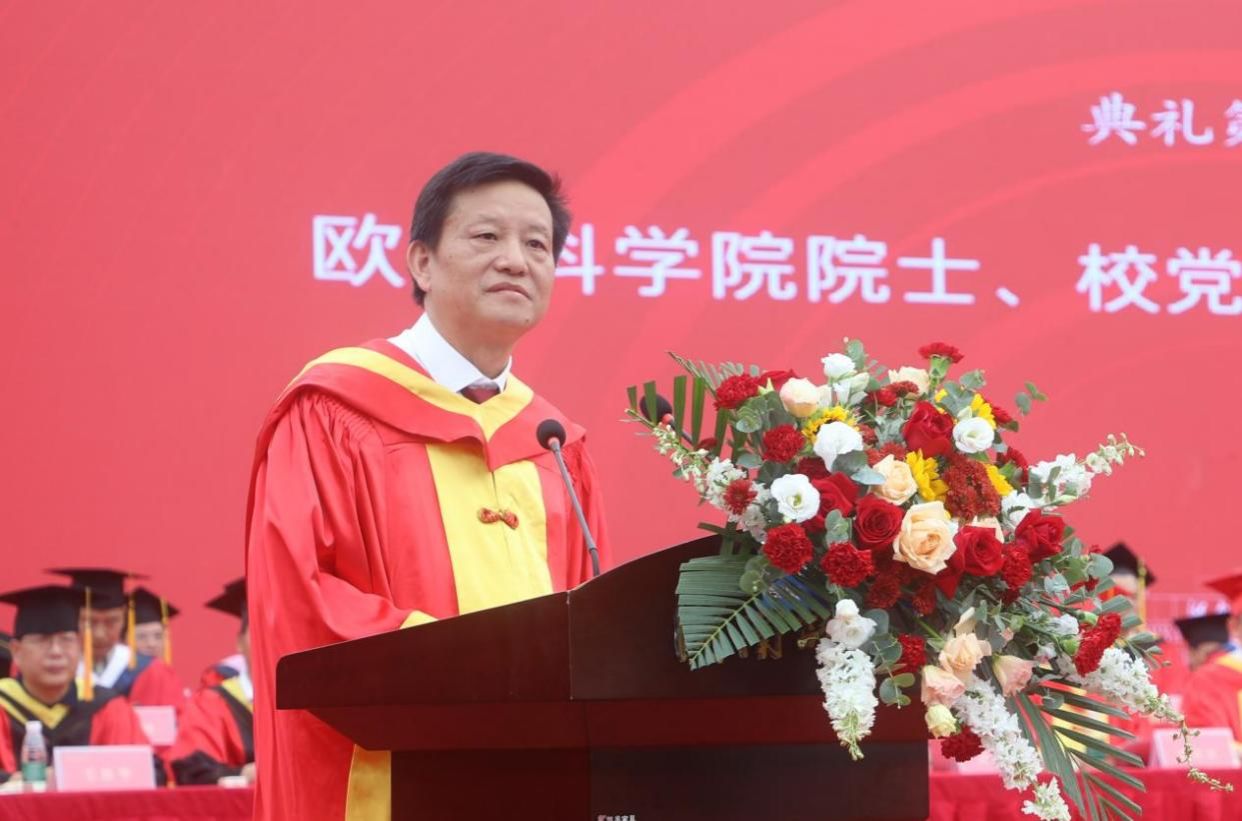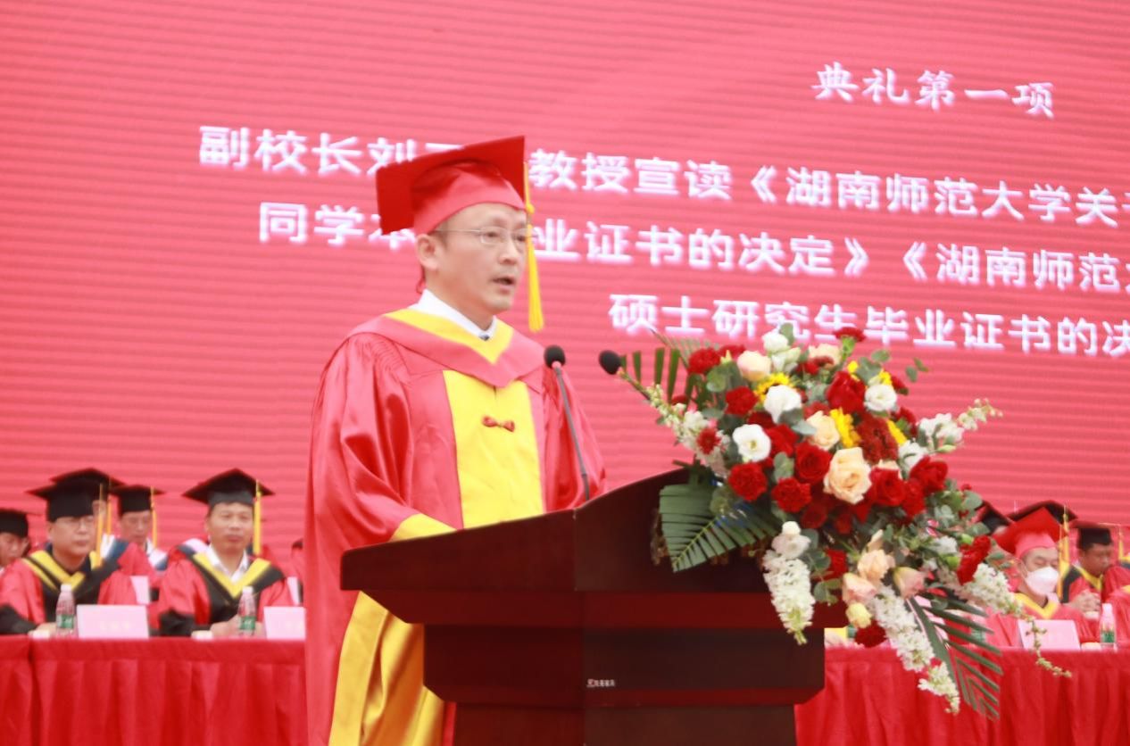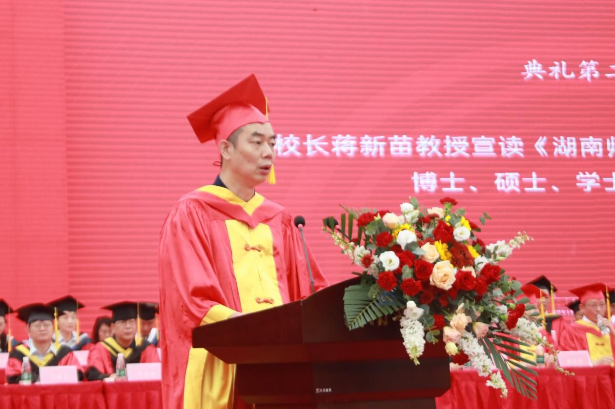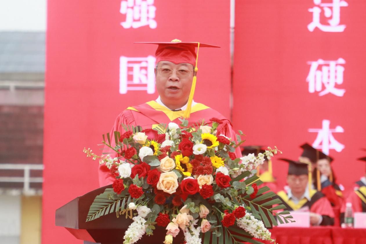 蒋洪新以“做青春的逐梦者”为题发表讲话。他代表学校向全体毕业生表示热烈祝贺,向所有关心、支持和帮助同学们成长成才的教职员工,亲友、校友和各界人士致以衷心感谢。他表示,同学们在师大的一千多个日日夜夜,与时代共奋进,与学校同发展,成为师大“辉煌、美丽和不朽”的风景。临别之际,他对毕业生提出三点希望:一是要胸怀“国之大者”,激扬青春梦想。爱国,是人世间最深层、最持久、最伟大的情感,希望大家以此为念,仰望星空,心存梦想,脚踏实地,善作善成,将爱国情、强国志、报国行融入青春梦想。二是要锤炼过硬本领,汇聚青春力量。博观而约取,厚积而薄发,希望大家继续保持对世界的好奇、对知识的渴求、对真理的探索,继续不断地提升自我、突破自我、成就自我,集聚起奔涌磅礴的青春力量。三是要勇于实干担当,书写青春华章。面对学业、事业与家庭的多重压力,可能少不了会委屈、困惑和不安,希望同学们少些抱怨,多一些调整和适应,心存一份感恩,保持一份热情,机遇总会眷顾那些正直、善良、且务实的人。